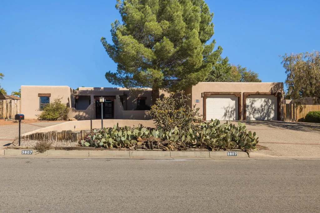 Wait until you see this Santa Fe style home in a wonderful location off NM528/Southern area. From the red brick flooring throughout the home to the Vigas in the Main Living areas, this home exudes New Mexico style. This home has 2 A/C combo units From Anderson Air corp, and a TPO roofing system from that has been cared for by the builder since it was installed. Large circle driveway for easy access. expansive primary suite w/ fireplace and walk in closet is separate from the other two bedrooms that share a full bathroom. Fourth bedroom could be in laws quarters or office. The main living area has an open floorplan and includes a dining area. This one is a must see. Enjoy the New Mexico weather on your covered patio with red brick flooring